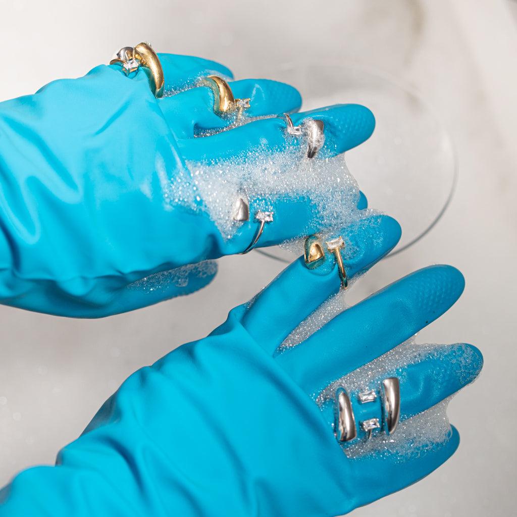 • Si deseas lavar tus joyas utiliza agua tibia y jabón (neutro), secándolas posteriormente con un paño de gamuza suave que no deje residuos para evitar manchas o ralladuras.
