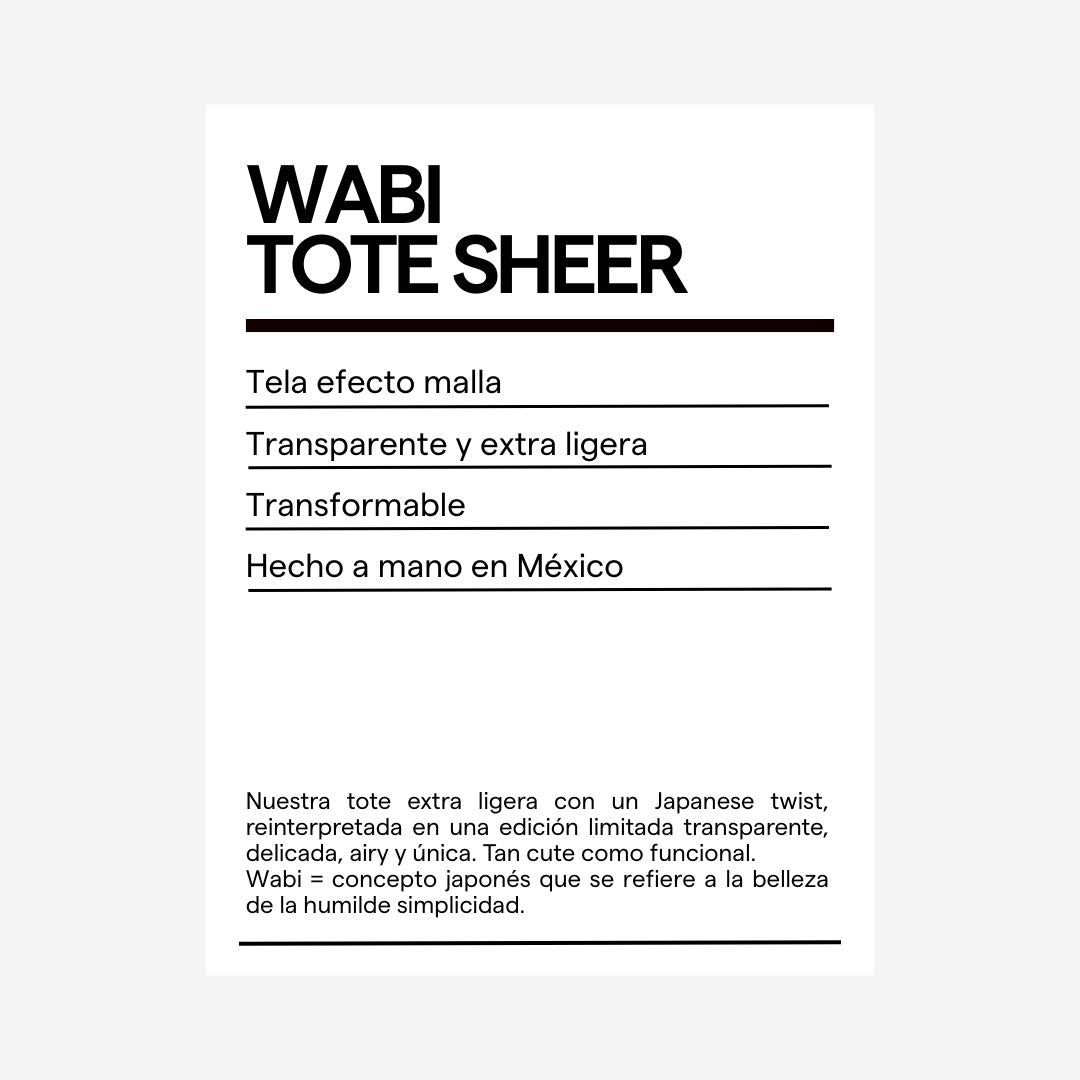 OJO: La Wabi Tote Sheer está hecha con una tela transparente y delicada, por lo que requiere un cuidado especial para evitar daños. Es más sensible que nuestra versión clásica en tela impermeable, así que trátala con cariño y evita cargarle demasiado peso.