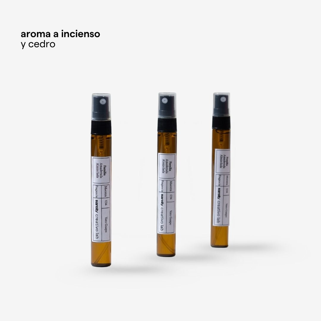 Mini fragancia de 10 mL con aroma de incienso y cedro.