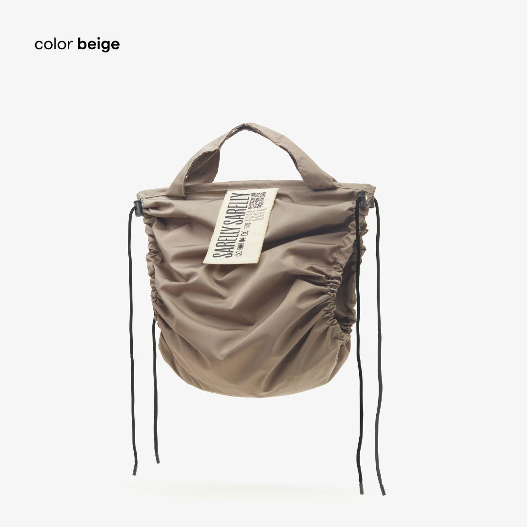 • Partes laterales de la bolsa fruncidas, con cordón y stopper