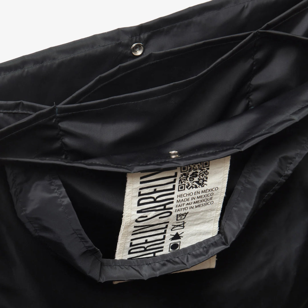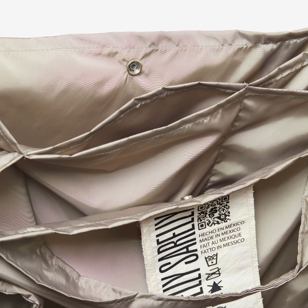 Nuestra tote extra ligera de tela impermeable con un Japanese twist. Cuenta con botón de presión para cerrarla y compartimentos.