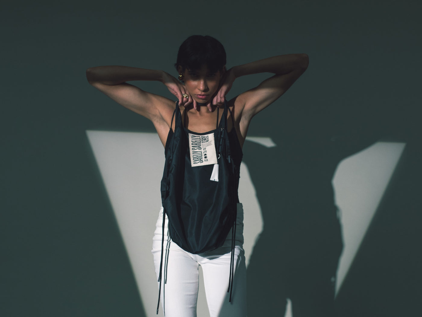 • Etiqueta oversize de algodón con logo "Sarelly Sarelly" y codigo QR hasta nuestra homepage